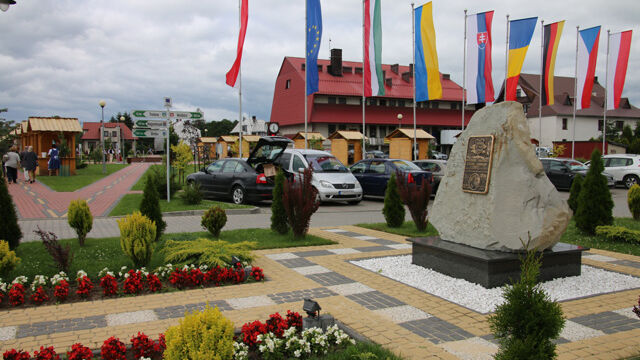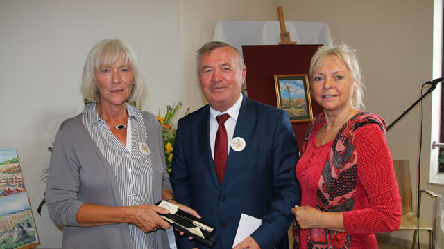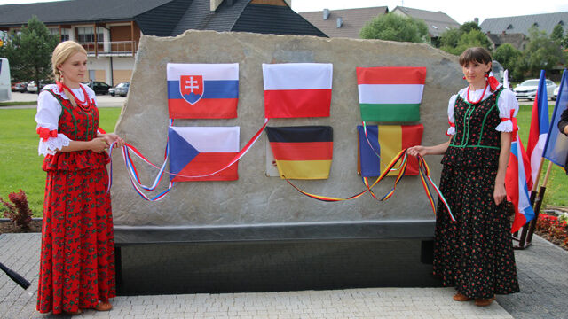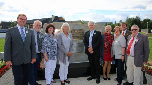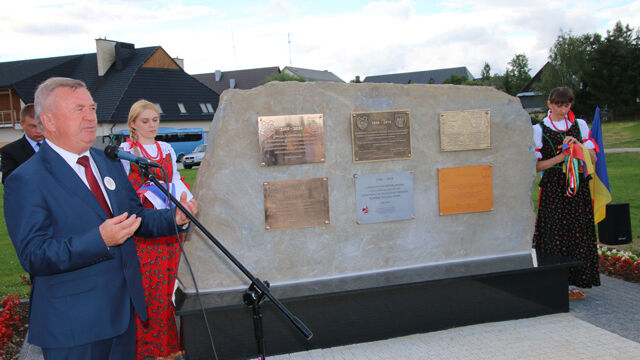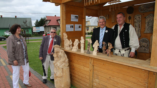 Bei einem gemeinsamen Treffen der Partnergemeinden lernten sich die einzelnen Delegationen näher kennen, Wünsche und Umsetzung einzelner Vorhaben konnten angesprochen werden. Hierbei überreichten Eva Eisenhauer und Annemarie Knichel vom Freundeskreis ein kleines Geschenk (aus der Odenwälder Mammutschnitzerei) an Herrn Karlak, der innerhalb Polens zum Bürgermeister des Jahres gewählt worden war. Im Anschluss erfolgte die Enthüllung der Gedenktafeln im Park der Gemeindeverwaltung. Mit den jeweiligen Nationalhymnen und kurzen Ansprachen der Bürgermeister enthüllten die sechs Partnergemeinden Gedenktafeln auf dem Steinblock.